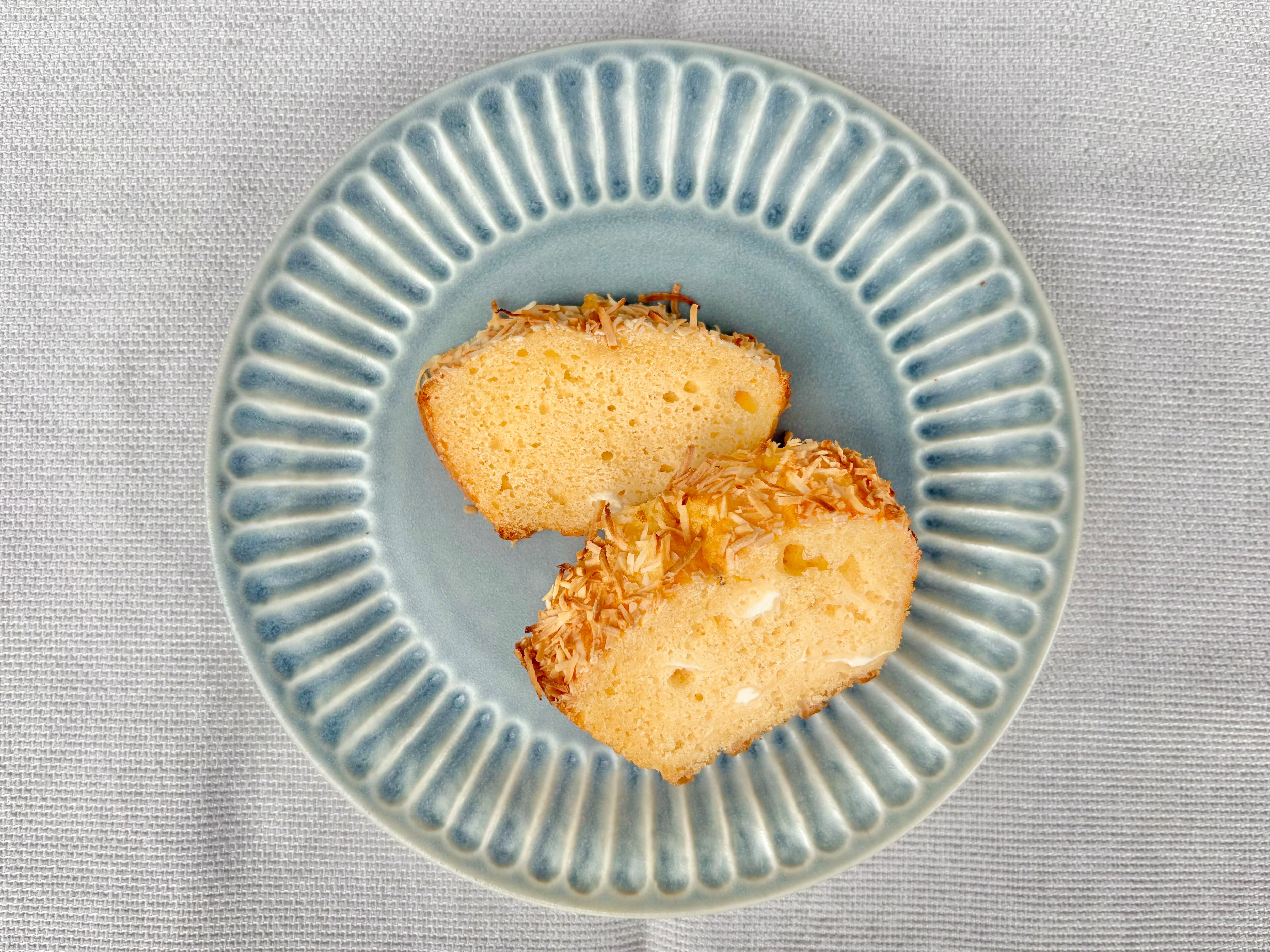 ヨーグルトを混ぜ込んだ爽やかな生地と、香ばしいココナツの香りと食感がとても良く合うさっぱり系のパウンドケーキです。
